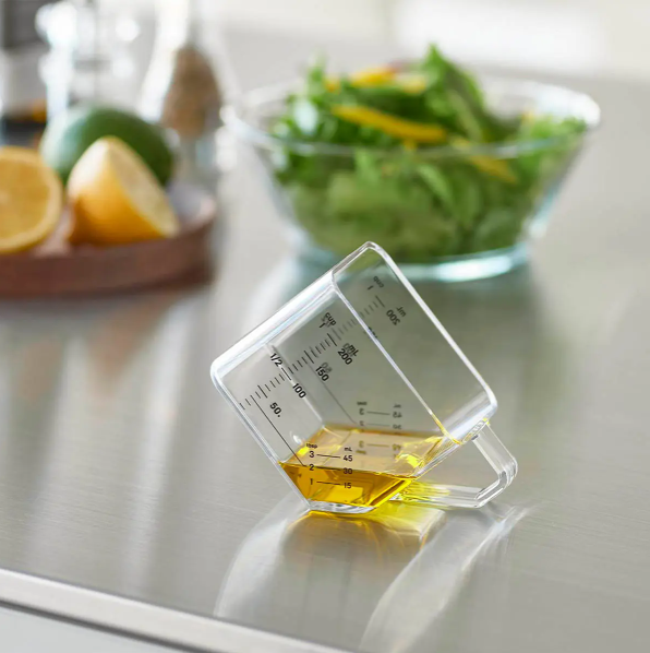 平置きで1カップ、斜め置きで大さじが計量できる「大さじも量れる計量カップ」