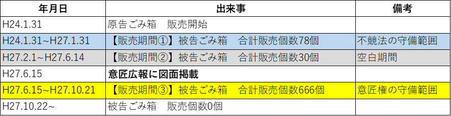 それまでの期間については、不競法(形態模倣行為)の守備範囲となるわけですが、販売開始(本件では平成24年1月31日)から3年間に限られます(前記時系列表の販売期間①)。