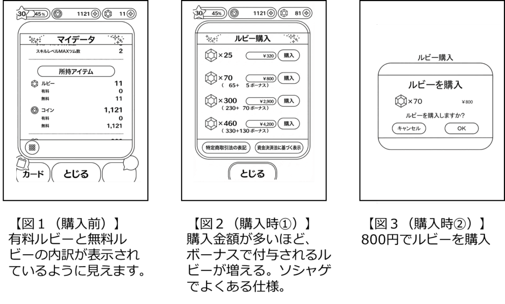 - 無料で取得されるルビー(その入手経路がゲームプレイであれ、課金時のボーナス付与であれ)とが存在し