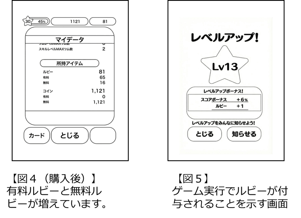 そして、購入ルビー(無料ルビー)は、購入手続を行うことによってユーザーに付与されるものであるから、構成要件1Aの文言どおり、「第1 の仮想アイテム」に該当するものといえる。そうすると、被告ゲームシステムにおいて、「第2の仮想アイテム」に該当するものは、ゲーム実行ルビーのみとなる。