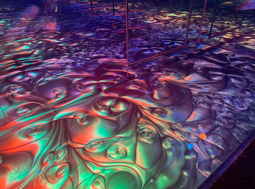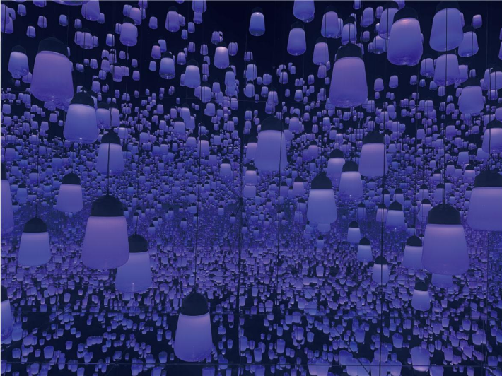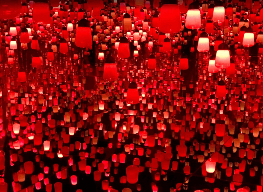 エリアに足を踏み入れると、数々のランプが吊り下げられて設置されています。さらに壁も、床も、天井も鏡張りになっていて、境界が曖昧になり、視界はどこまでも続いているように見えるのです。どこまでも続く無数のランプに囲まれているような感覚になります。