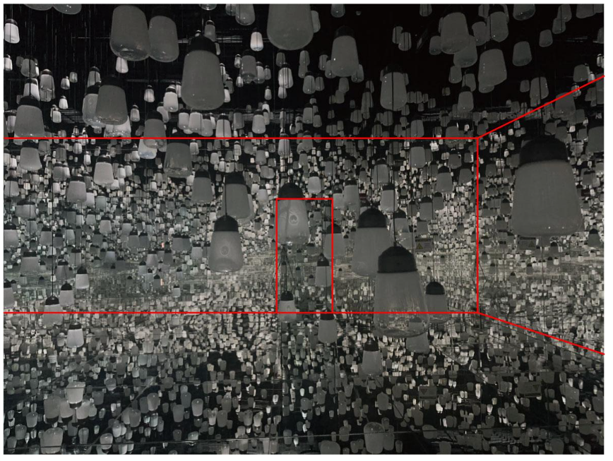 意匠登録された「展示室の内装」は、単にランプという物体の形を守っているのではありません。無数のランプの配置と、鏡面による反射とが組み合わさって生まれる、空間全体の「見え方」を保護しています。鑑賞者がどの方向を向いても、境界が消え、この空間が続いているように見える。