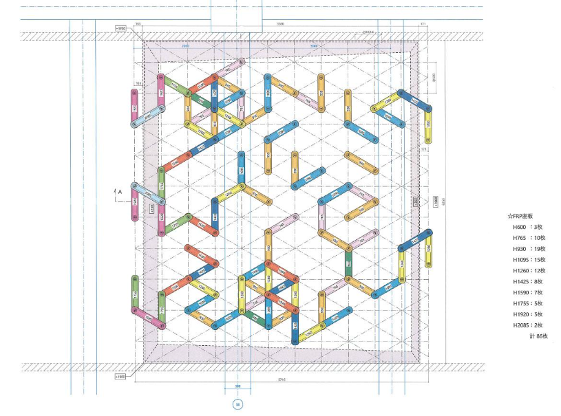 例えば、下に示す【踏み板の高さ寸法を示した参考平面図】は、配置される高さごとに板が色分けされています。また、複数のルートで人間が岸から岸へと渡れるように、平面方向に板が配置されていることがわかります。