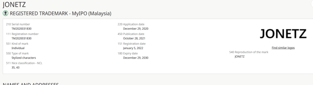 マレーシアで商標登録された”JONETZ” | WIPO Brand Database