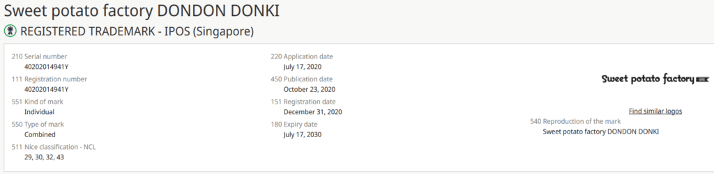 シンガポールで商標登録されたSweet potato factory DONDON DONKI | WIPO Brand Database