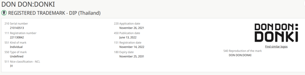 タイで商標登録されたDON DON DONKI | WIPO Brand Database