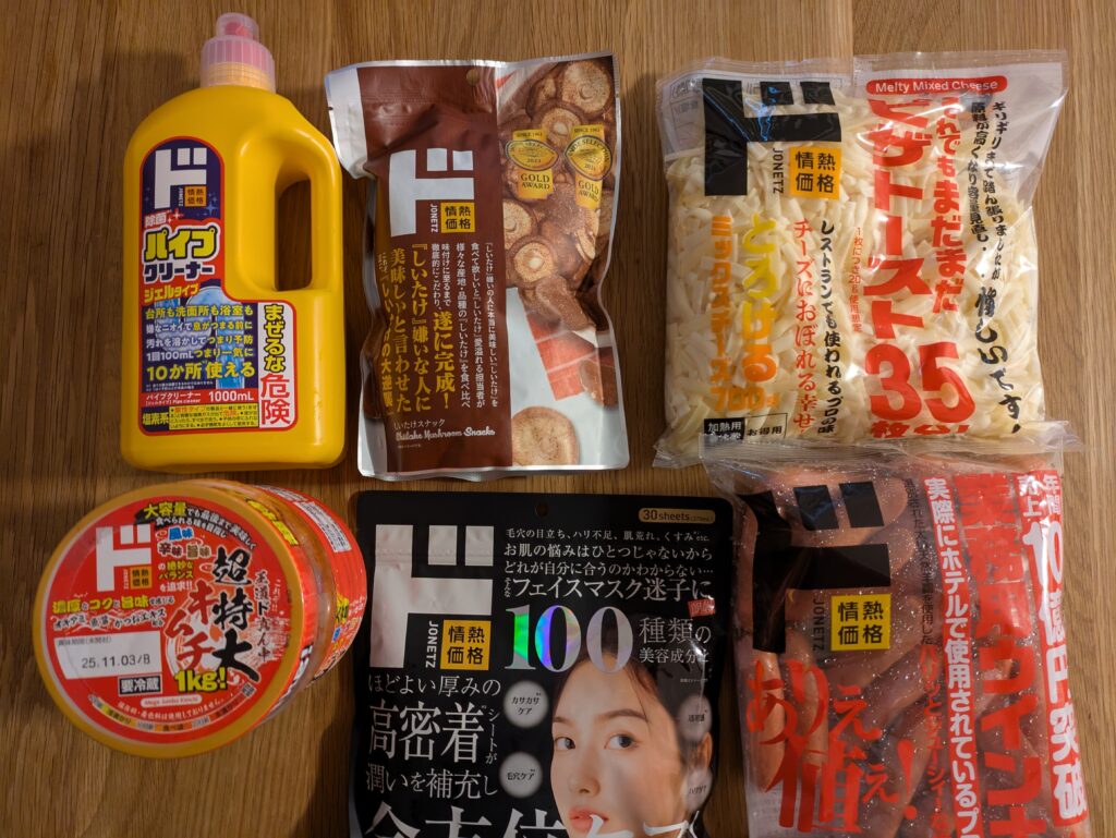 これは筆者のとある日の購入品なのですが、パイプクリーナー、しいたけスナック、チーズ、キムチ、フェイスパック、ソーセージ、そのすべてに「ド」の文字からなるロゴがあしらわれています。