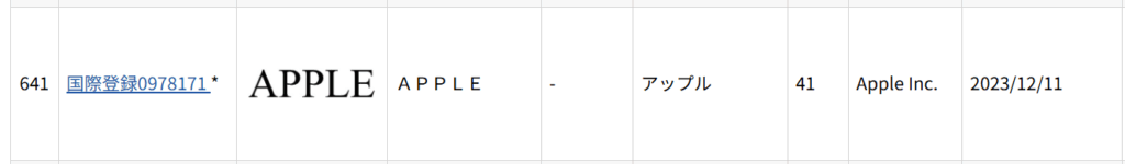 「APPLE」名称は、2023年にも指定商品・役務を幅広く記載した出願が見つかり、事業領域の拡大に合わせて、継続的に商標登録を拡充していることがわかります。