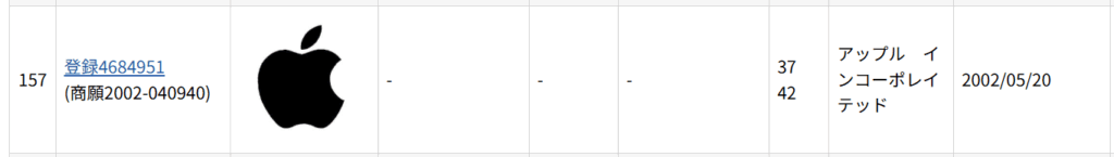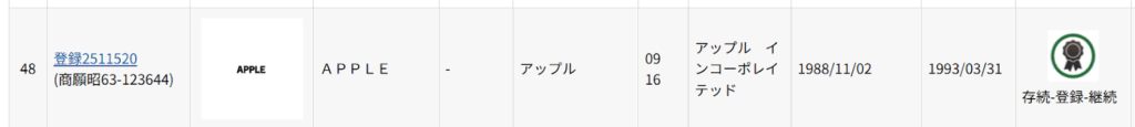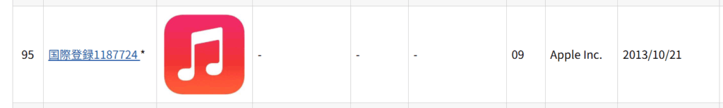 一方で、Appleのコアブランドである「リンゴマーク」および「APPLE」については、非常に手厚い保護が施されています。いくつかの登録例を紹介します。