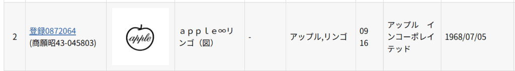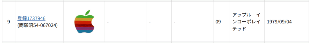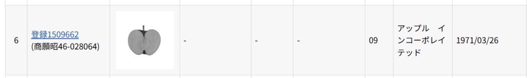リンゴマークの最古の登録は1968年にさかのぼり、現在でも継続的に新たな出願を行っています。興味深いのはリアルなリンゴの画像も登録している点ですね。続いては社名の登録例です。