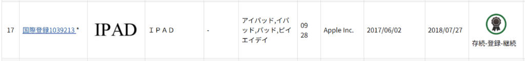 「IPAD」商標を例に見ると、「国際登録」と記載されていることがわかります。出願人がApple Inc.となっている国際登録は日本特許庁データベースで647件確認できました(2025年10月時点)。